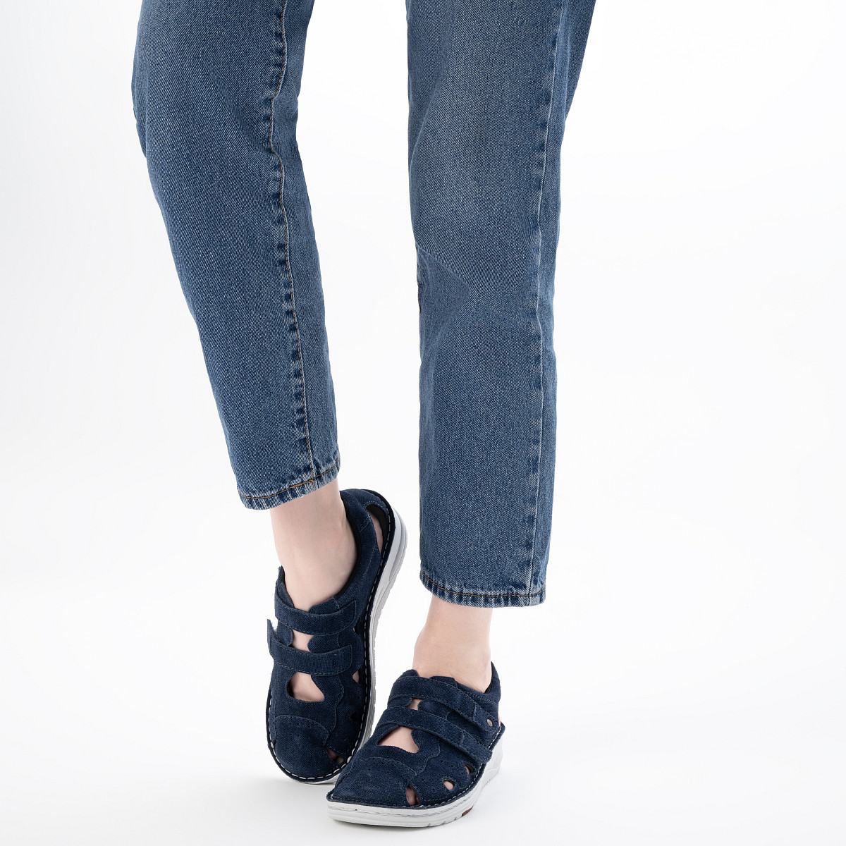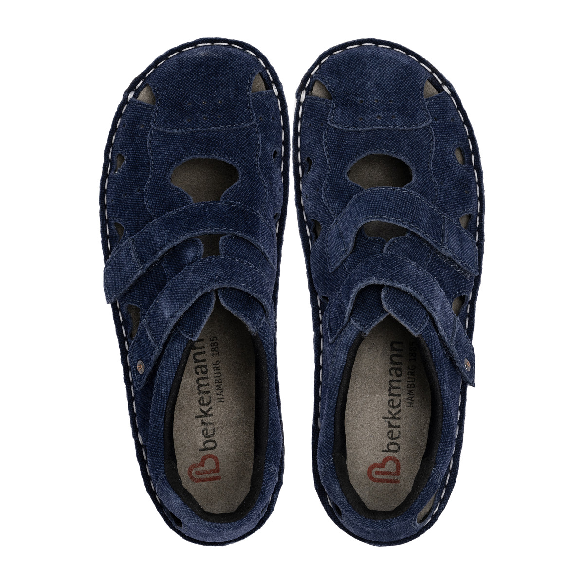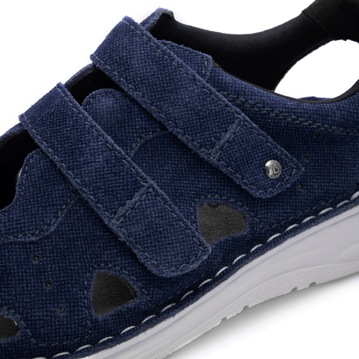 Berkemann Larena — женские ортопедические сандалеты из натурального нубука для активных прогулок и повседневной носки. Закрытый мыс надежно защищает пальцы, а закрытая пятка помогает лучше фиксировать стопу при движении по различным поверхностям. Две застежки на липучках Velcro позволяют быстро отрегулировать посадку по подъему и полноте, а перфорация в верхней части поддерживает комфортный микроклимат внутри обуви. Съемная пятифазная стелька с анатомической поддержкой сводов и аккуратная ручная строчка подчеркивают продуманный, практичный и в то же время современный характер модели.