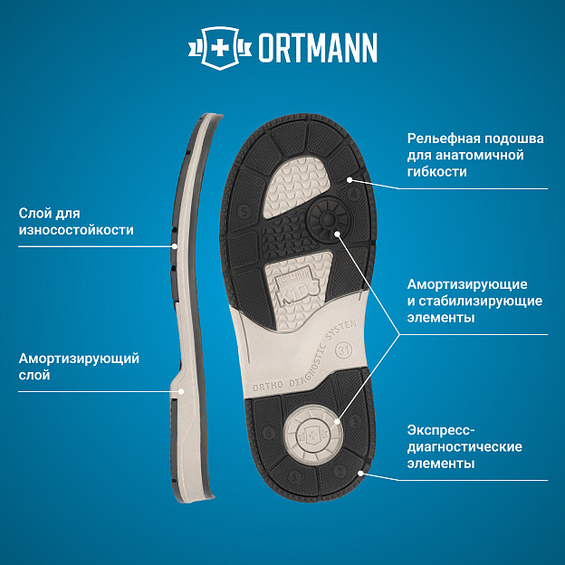 • «умная» подошва с рельефными вставками и стабилизирующими элементами помогает выявить и разгрузить проблемные зоны, повышает устойчивость и делает шаг более уверенным;