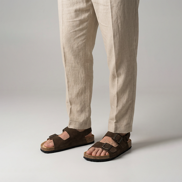 Анатомическая стелька на основе коры пробкового дуба поддерживает своды стопы и помогает равномерно распределять нагрузку по всей поверхности. Чашеобразная пятка мягко фиксирует заднюю часть стопы, снижая риск завала, а легкая амортизирующая подошва гасит ударную нагрузку при ходьбе и способствует снижению утомляемости ног.