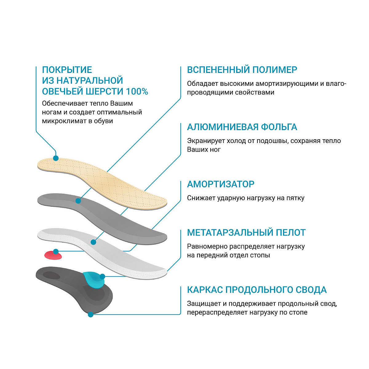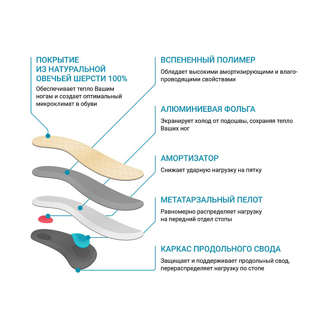 • покрытие из натуральной 100% овечьей шерсти обеспечивает ногам тепло и создает оптимальный микроклимат в обуви, что улучшает кровообращение стоп и общее самочувствие;