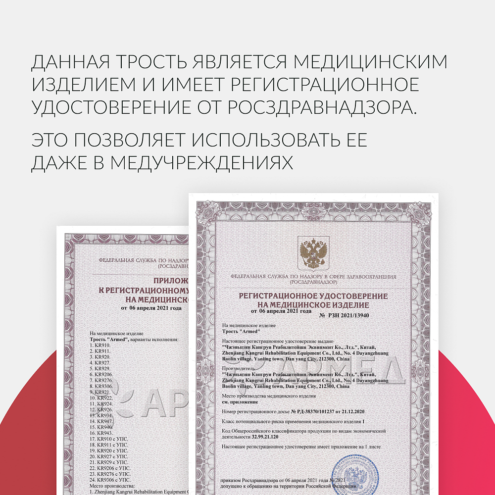 • Трость Armed KR929 с телескопической регулировкой высоты и анатомической Т‑образной ручкой;
