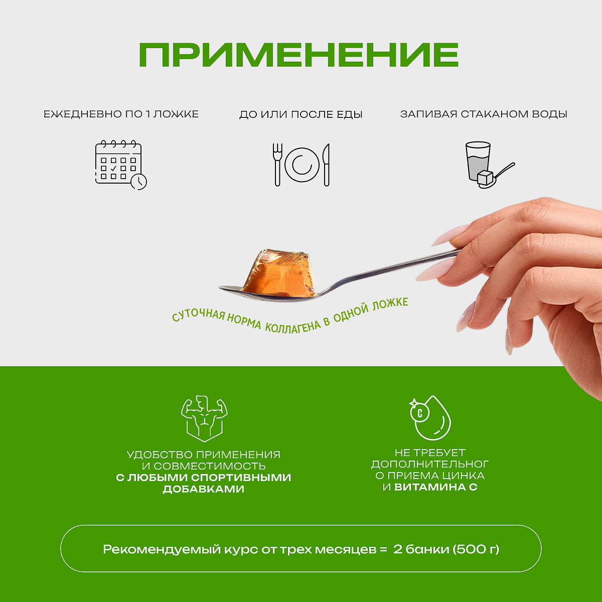 Принимайте коллаген в виде желе от 1 чайной до 1 столовой ложки в день. Рекомендуемое время приема — за 30 минут до или после еды, запивая стаканом чистой воды для лучшего усвоения.