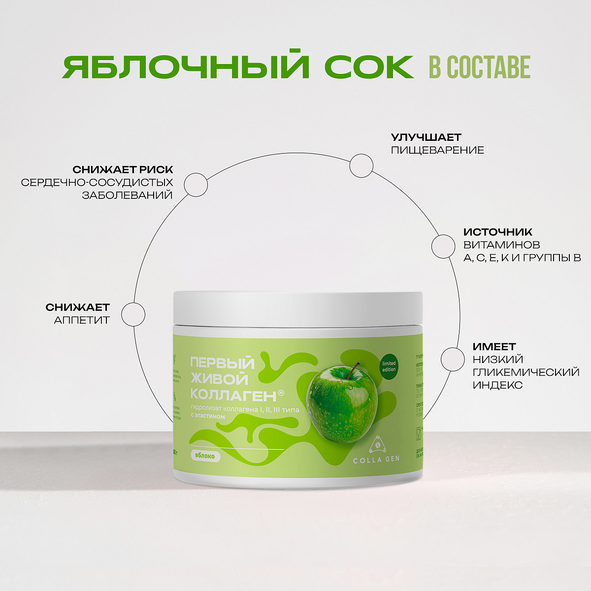 • Со вкусом яблока: гидролизат коллагена пищевой, сок яблочный концентрированный, вода очищенная, ароматизатор пищевой.