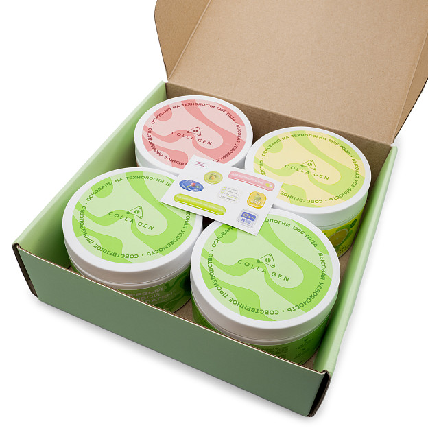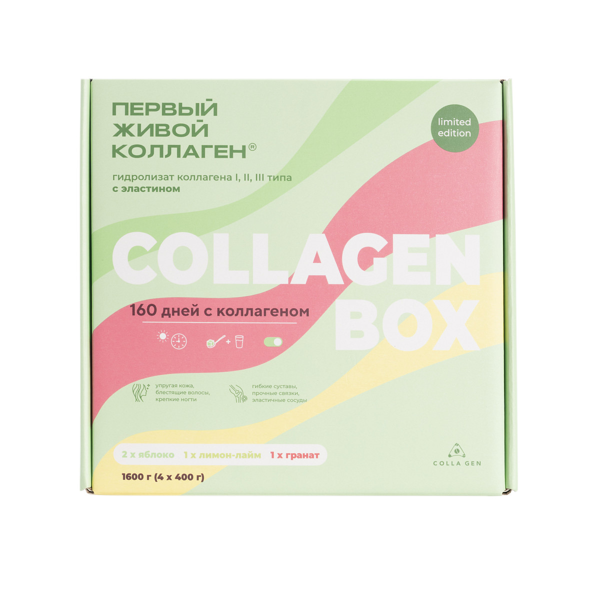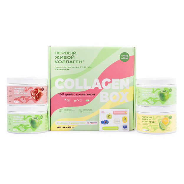 COLLAGEN BOX — лимитированная коллекция коллагена, которая включает в себя полный курс для комплексного восстановления организма, продления молодости и сохранения здоровья суставов. Набор состоит из четырех банок гидролизованного коллагена в удобной желеобразной форме. Комплекс разработан для системного воздействия, а чтобы прием препарата был приятным, комфортным и приносил удовольствие, производитель предлагает три вкуса — яблоко, лимон-лайм, гранат.