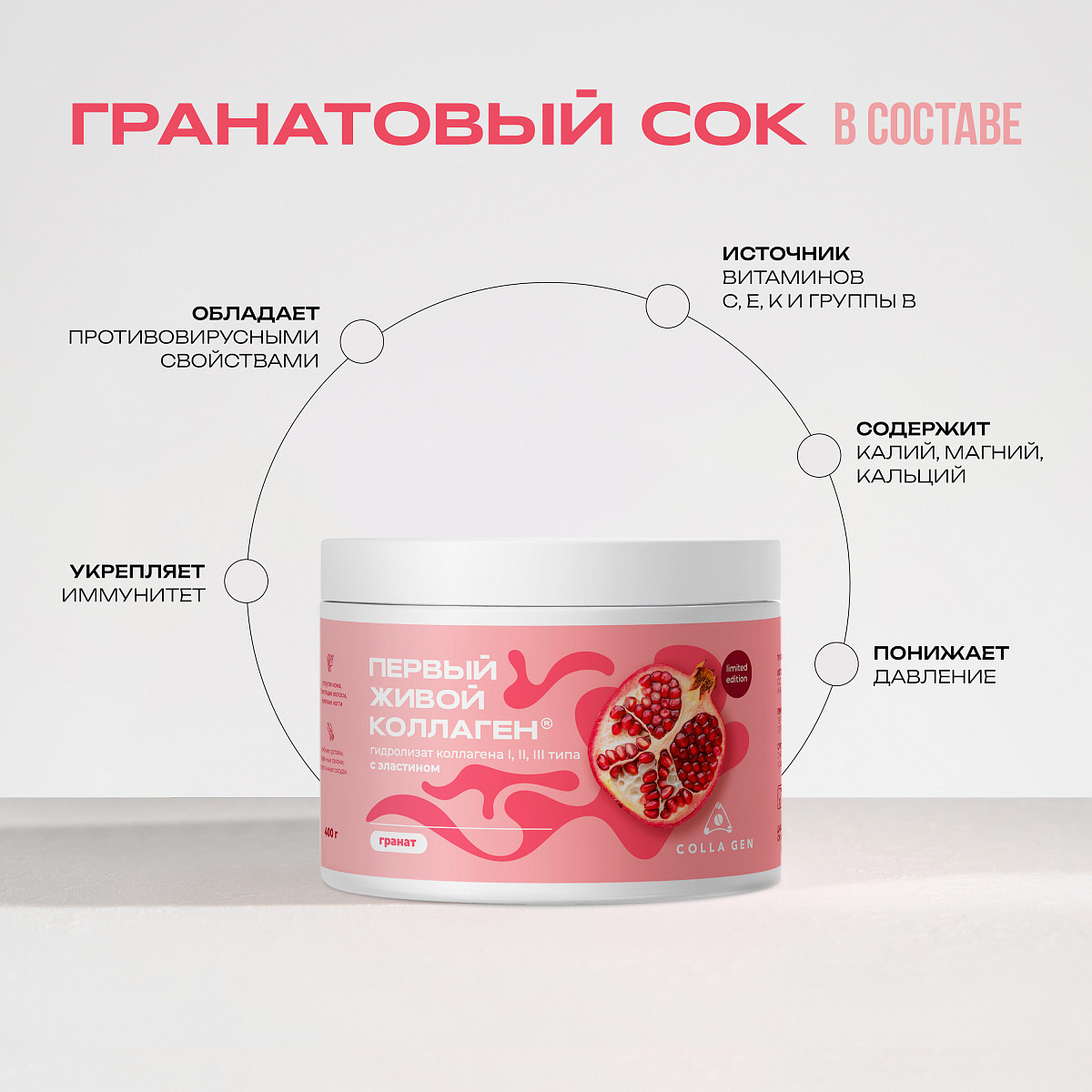 • Со вкусом граната: гидролизат коллагена пищевой, сок яблочный концентрированный, сок гранатовый концентрированный, сок вишневый концентрированный, вода очищенная, ароматизатор пищевой.