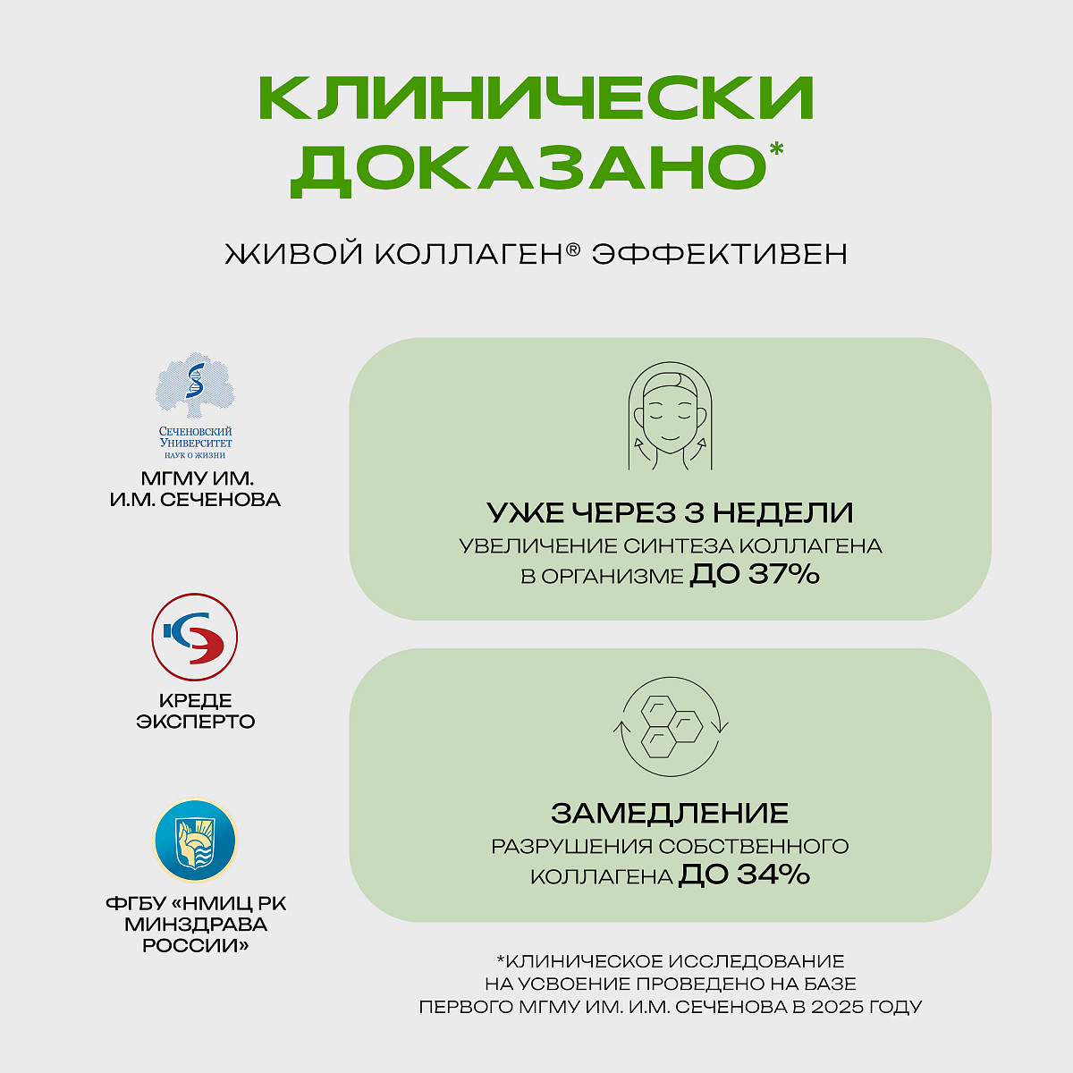 Увеличивает синтез собственного коллагена в организме на 37%; замедляет разрушение существующих коллагеновых волокон до 34%; первые положительные биохимические изменения отмечаются уже через 21 день регулярного приема.