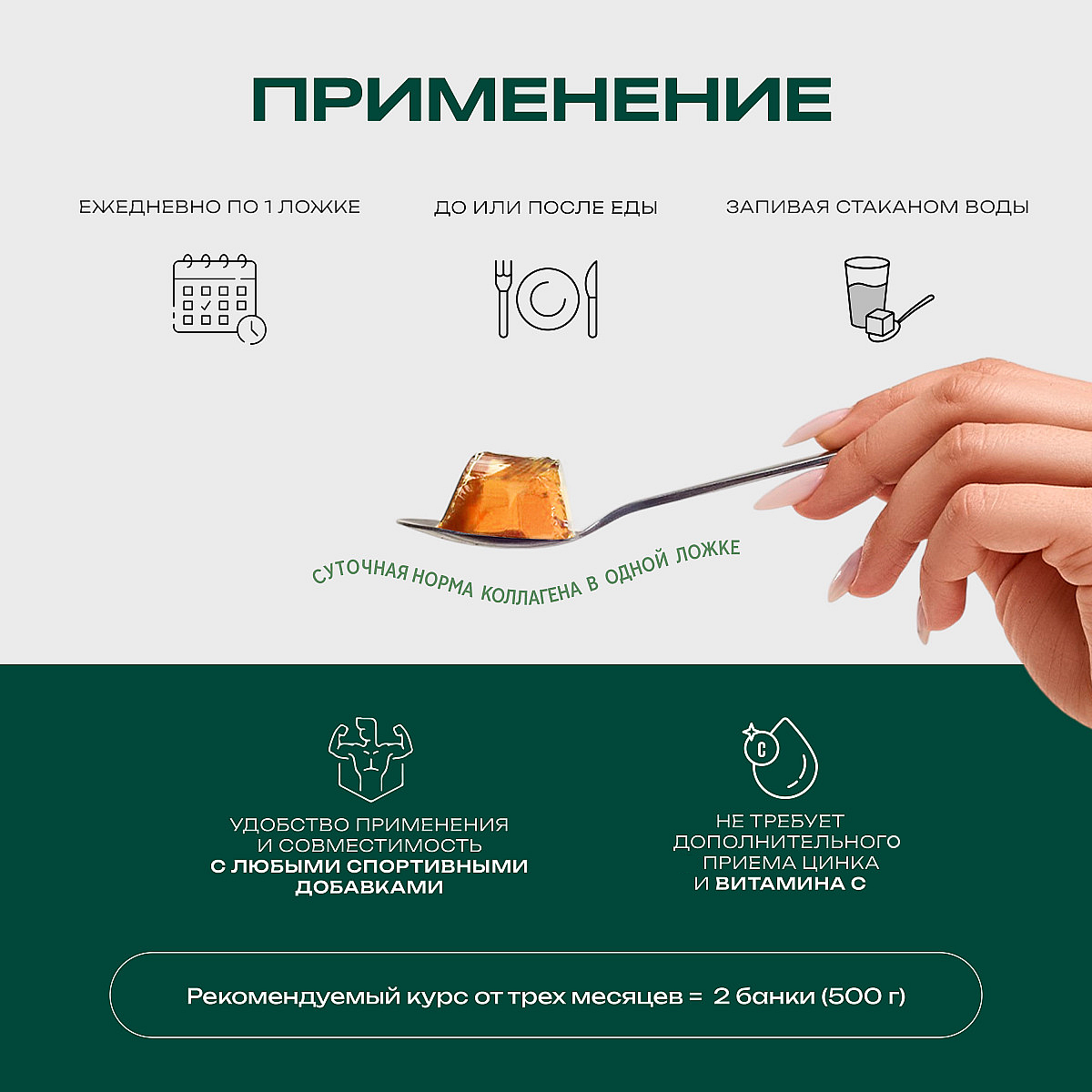 • Не требует и не содержит витамина С: высокая усвояемость за счет содержания аминокислот оксипролина и оксилизина, которые в том числе запускают синтез собственного коллагена;